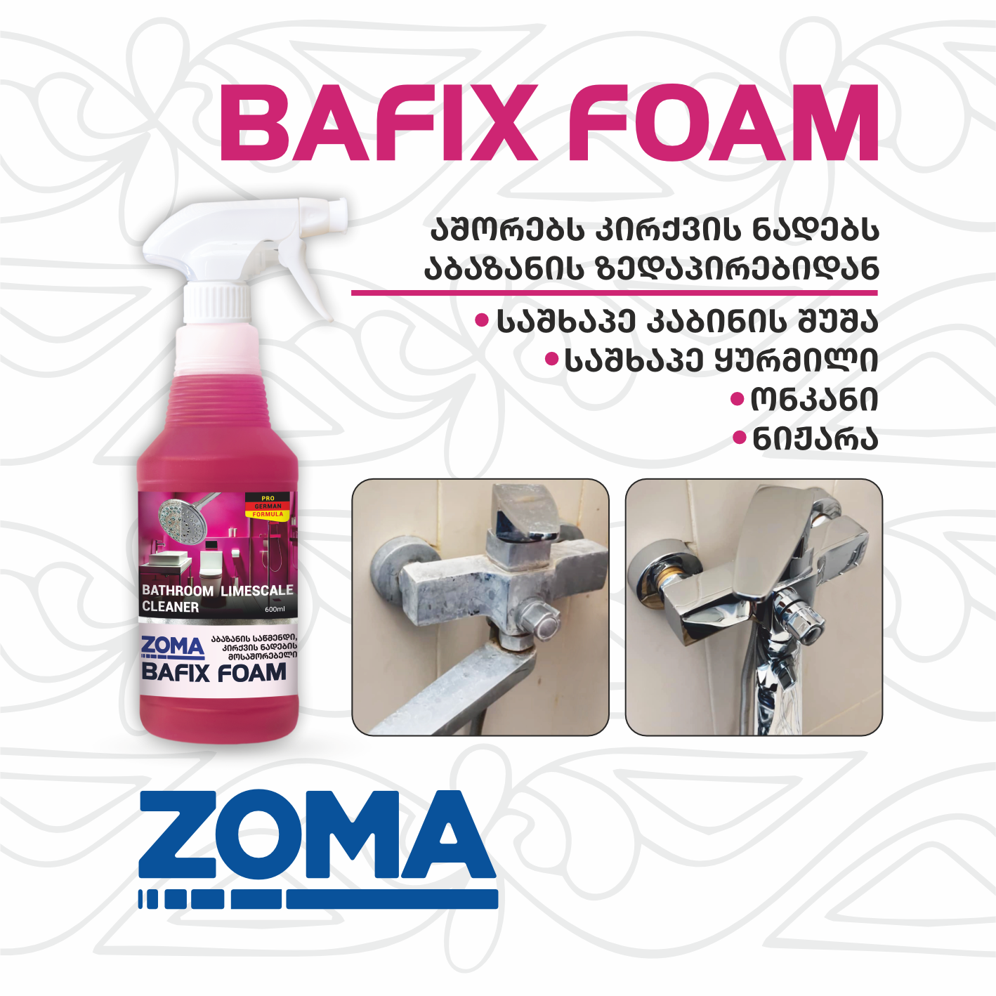 უსაფრთხოება: არ შეურიოთ Zoma Bafix Foam ქლორის შემცველ საშუალებებს.